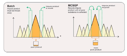 ?????? MCSGP工藝,可將含有不純組分的產(chǎn)品回收在一個封閉的環(huán)內(nèi),進行循環(huán)式的層析操作,從而最大限度地提取純產(chǎn)品,使得收率和純度二者兼得。