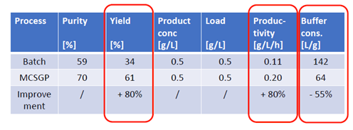 ??? 有案例證明,MCSGP可將產(chǎn)品純度從傳統(tǒng)工藝的59%提升至70%,將收率從傳統(tǒng)工藝的34%提升至61%,從而使產(chǎn)量(g /L /h)整體提升80%,并同時使Buffer的消耗量降低55%。MCSGP工藝,無疑可顯著地節(jié)約成本投入,并可產(chǎn)生更多的生產(chǎn)效益。
