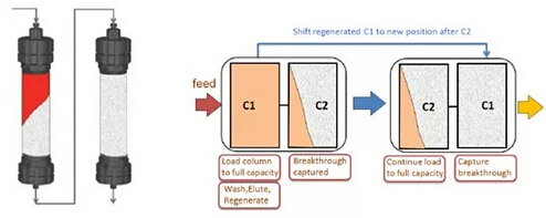? ? 傳統(tǒng)層析工藝,由于流穿效應(yīng),有30-50%的填料是無法被完全利用的,從而使得載量和處理量大為受限。Capture SMB用于優(yōu)化捕獲環(huán)節(jié),作為最簡(jiǎn)單和最優(yōu)化的2柱位設(shè)計(jì),可使純化效率顯著提高,并且使填料用量大為縮減。